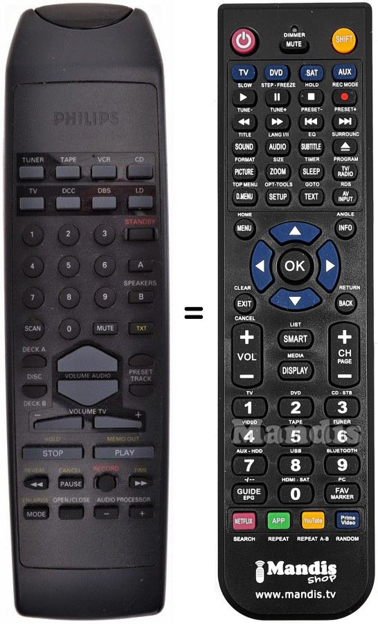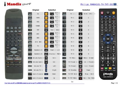 A continuació, us mostrarem la correspondència entre cada un dels botons del comandament original i el botó que realitza la mateixa funció en el comandament de substitució. En alguns casos, és possible que necessiti prémer la tecla SHIFT abans de prémer un altre botó per realitzar certes accions. Aquestes funcions addicionals sovint no s'utilitzen gaire i s'inclouen per facilitar la comprensió del comandament de substitució, o perquè el comandament original té més botons que el seu equivalent.