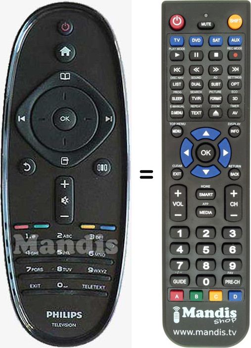 A continuació, us mostrarem la correspondència entre cada un dels botons del comandament original i el botó que realitza la mateixa funció en el comandament de substitució. En alguns casos, és possible que necessiti prémer la tecla SHIFT abans de prémer un altre botó per realitzar certes accions. Aquestes funcions addicionals sovint no s'utilitzen gaire i s'inclouen per facilitar la comprensió del comandament de substitució, o perquè el comandament original té més botons que el seu equivalent.