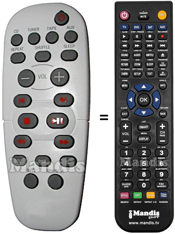 Aquest comandament a distància fa totes les funcions del comandament original: Power, CD, TUNER, TAPE, AUX, Repeat, Shuffle, Sleep, Vol-, Vol+, I<, >I, Stop, Play / Pause, <<, >>, DSC, DBB, IS, Mute, News / TA