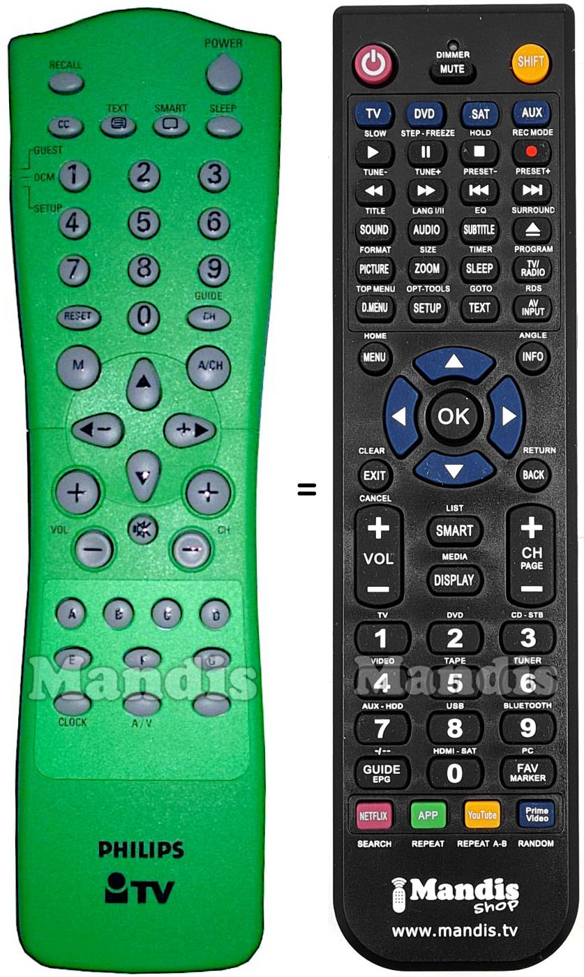 A continuació, us mostrarem la correspondència entre cada un dels botons del comandament original i el botó que realitza la mateixa funció en el comandament de substitució. En alguns casos, és possible que necessiti prémer la tecla SHIFT abans de prémer un altre botó per realitzar certes accions. Aquestes funcions addicionals sovint no s'utilitzen gaire i s'inclouen per facilitar la comprensió del comandament de substitució, o perquè el comandament original té més botons que el seu equivalent.