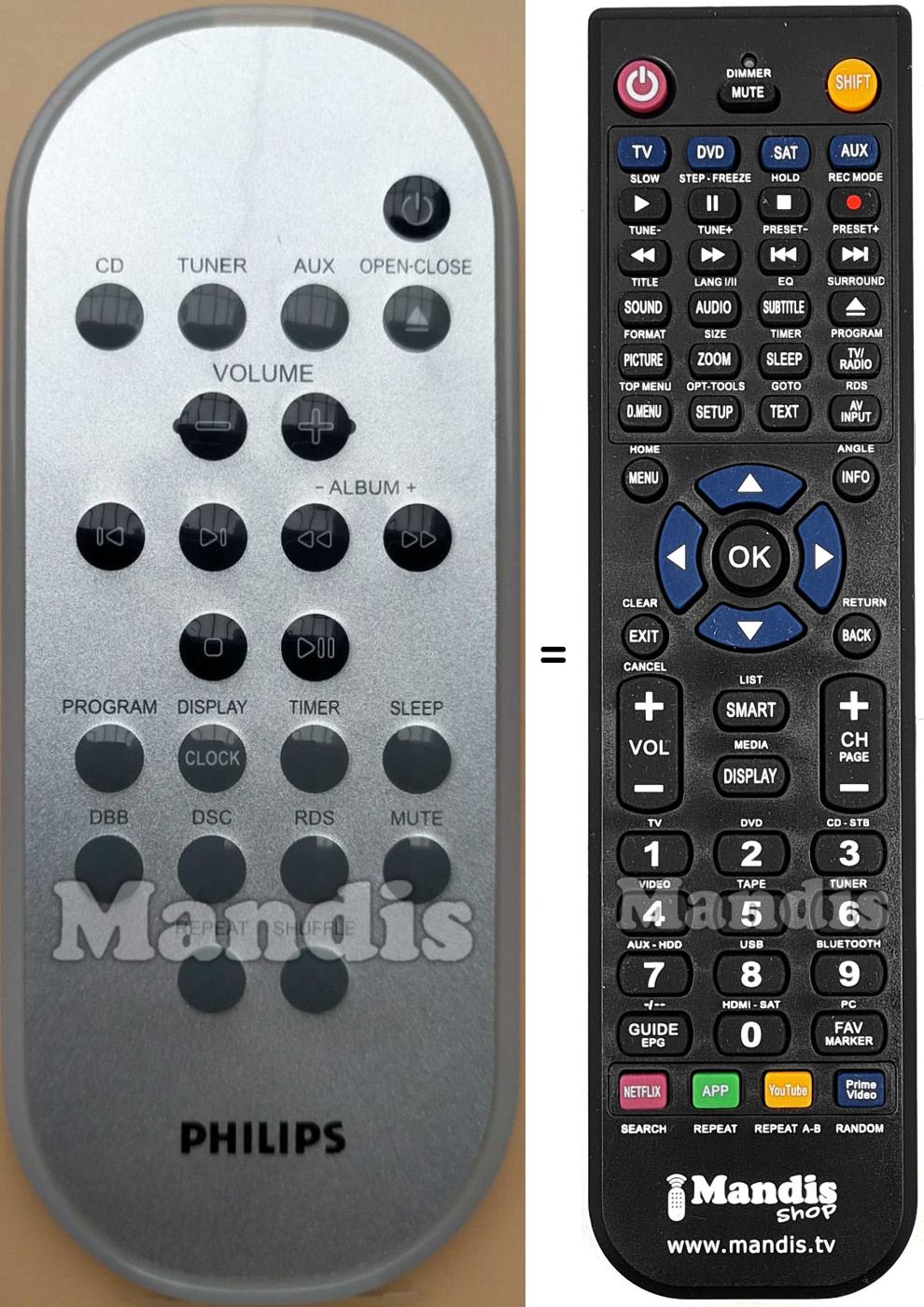 A continuació, us mostrarem la correspondència entre cada un dels botons del comandament original i el botó que realitza la mateixa funció en el comandament de substitució. En alguns casos, és possible que necessiti prémer la tecla SHIFT abans de prémer un altre botó per realitzar certes accions. Aquestes funcions addicionals sovint no s'utilitzen gaire i s'inclouen per facilitar la comprensió del comandament de substitució, o perquè el comandament original té més botons que el seu equivalent.