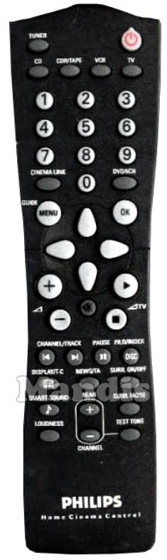Power, Tuner, CD, CDR / Tape, VCR, TV, 1, 2, 3, 4, 5, 6, 7, 8, 9, 0, Cinema Link, DVD / 6 CH., Menu / Guide, OK, Up, Right, Down, Left, Vol +, Vol -, Mute, Play / TV Vol +, Stop / TV Vol -, I< / Channel - / Track -, >I / Channel + / Track +, Pause, Disc / FR.D./Index, Text / Display / T-C, News / TA, Surr. On / Off, Smart Sound, Surr. Mode, Loudness, Rear Channel +, Rear Channel -, Test Tone