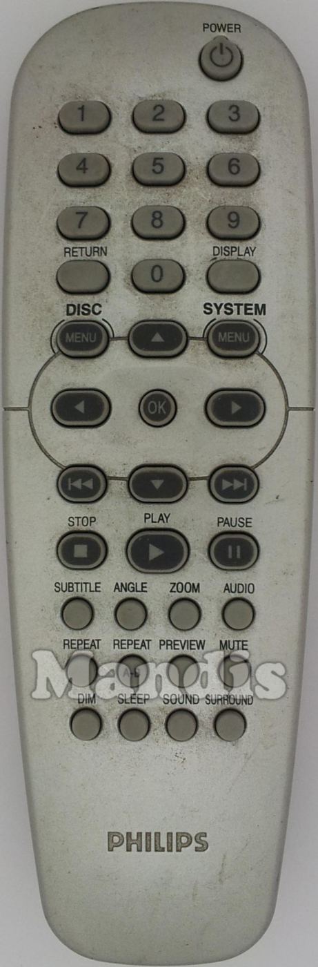 Power, 1, 2, 3, 4, 5, 6, 7, 8, 9, 0, Return, Display, Menu Disc, Menu System, Up, Down, Right, Left, OK, I<<, >>I, Stop, PLay, Pause, Subtitle, Angle, Zoom, Audio, Repeat, Repeat A-B, Preview, Mute, DIM, Sleep, Sound, Surround