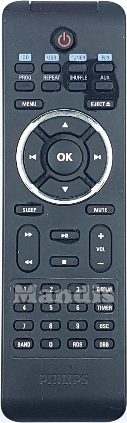 CD, USB, Tuner, iPod, PROG, Repeat, Shuffle, AUX, Menu, Eject, Up, Down, Left/I<, Right/>I, OK, Sleep, Mute, Play/Pause, Stop, >>, <<, Vol+, Vol-, 1, 2, 3, 4, 5, 6, 7, 8, 9, 0, Band, Display, Timer, DSC, RDS, DBB