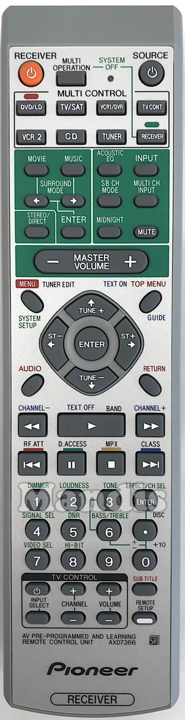 Power Receiver, Multi Operation, Receiver, TV Cont, Power Source, DVD / LD, TV / SAT, VCR 1 / DVR, VCR 2, CD, TUNER, Surround Mode Movie, Surround Mode Music, Surround Mode Left, Surround Mode Right, Surround Mode Enter, Stereo / Direct, Acustic EQ, Input, SB CH Mode, Multi CH Input, Midnight, Mute, Master Volume-, Master Volume+, System Setup / Menu / Tuner Edit, Text On / Top Menu / Guide, Up / Tune+, Down / Tune-, Right / ST+, Left / ST-, Enter, Audio, Return, << / Channel-, Play / Text Off / Band, >> / Channel+, I<< / Ref Att / Red, Pause / D.Access / Green, Stop / MPX / Yellow, >>I / Class / Blue, 1 / Dimmer, 2 / Loudness, 3 / Tone, 4 / Signal Sel, 5 / DNR, 6 / Bass/Treble, 7 / Video Sel, 8 / HiBit, 9, Enter / Effect / CH.Sel, . / Disc / Tone/Bass/Treble+, 0 / +10 / Tone/Bass/Treble-, Sub Title, Remote SEtup, TV Power, TV Input Select, TV Channel+, TV Channel-, TV Volume+, TV Volume-