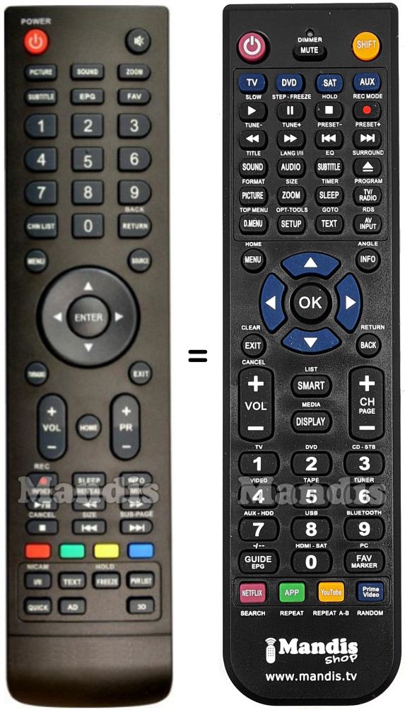 A continuació, us mostrarem la correspondència entre cada un dels botons del comandament original i el botó que realitza la mateixa funció en el comandament de substitució. En alguns casos, és possible que necessiti prémer la tecla SHIFT abans de prémer un altre botó per realitzar certes accions. Aquestes funcions addicionals sovint no s'utilitzen gaire i s'inclouen per facilitar la comprensió del comandament de substitució, o perquè el comandament original té més botons que el seu equivalent.