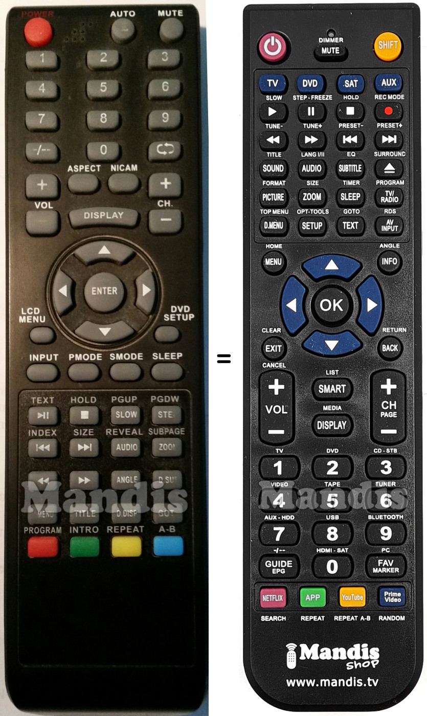 A continuació, us mostrarem la correspondència entre cada un dels botons del comandament original i el botó que realitza la mateixa funció en el comandament de substitució. En alguns casos, és possible que necessiti prémer la tecla SHIFT abans de prémer un altre botó per realitzar certes accions. Aquestes funcions addicionals sovint no s'utilitzen gaire i s'inclouen per facilitar la comprensió del comandament de substitució, o perquè el comandament original té més botons que el seu equivalent.