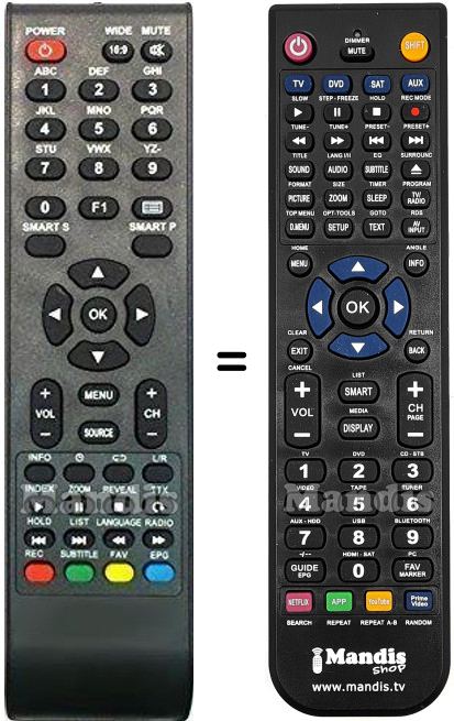A continuació, us mostrarem la correspondència entre cada un dels botons del comandament original i el botó que realitza la mateixa funció en el comandament de substitució. En alguns casos, és possible que necessiti prémer la tecla SHIFT abans de prémer un altre botó per realitzar certes accions. Aquestes funcions addicionals sovint no s'utilitzen gaire i s'inclouen per facilitar la comprensió del comandament de substitució, o perquè el comandament original té més botons que el seu equivalent.