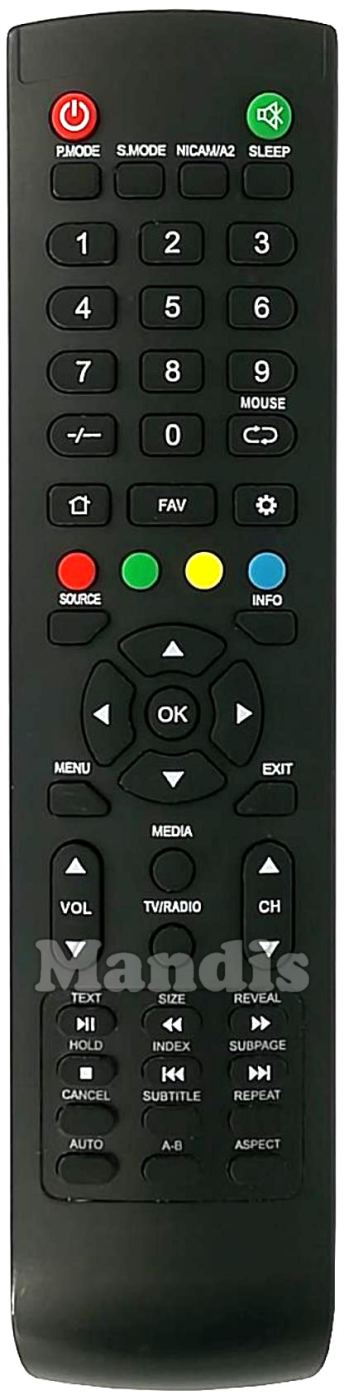 Power, Mute, P.Mode, S.Mode, Nicam / A2, Sleep, 1, 2, 3, 4, 5, 6, 7, 8, 9, 0, -/--, Recall / Mouse, Home, Fav, Settings, Red, Green, Yellow, Blue, Source, Info, Up, Right, Left, OK, Menu, Exit, Media, TV / Radio, Vol +, Vol -, CH +, CH -, Play/Pause / Text, << / Size, >> / Reveal, Stop / Hold, I<< / Index, >>I / Subpage, Cancel, Subtitle, Repeat, Auto, A-B, Aspect, Down