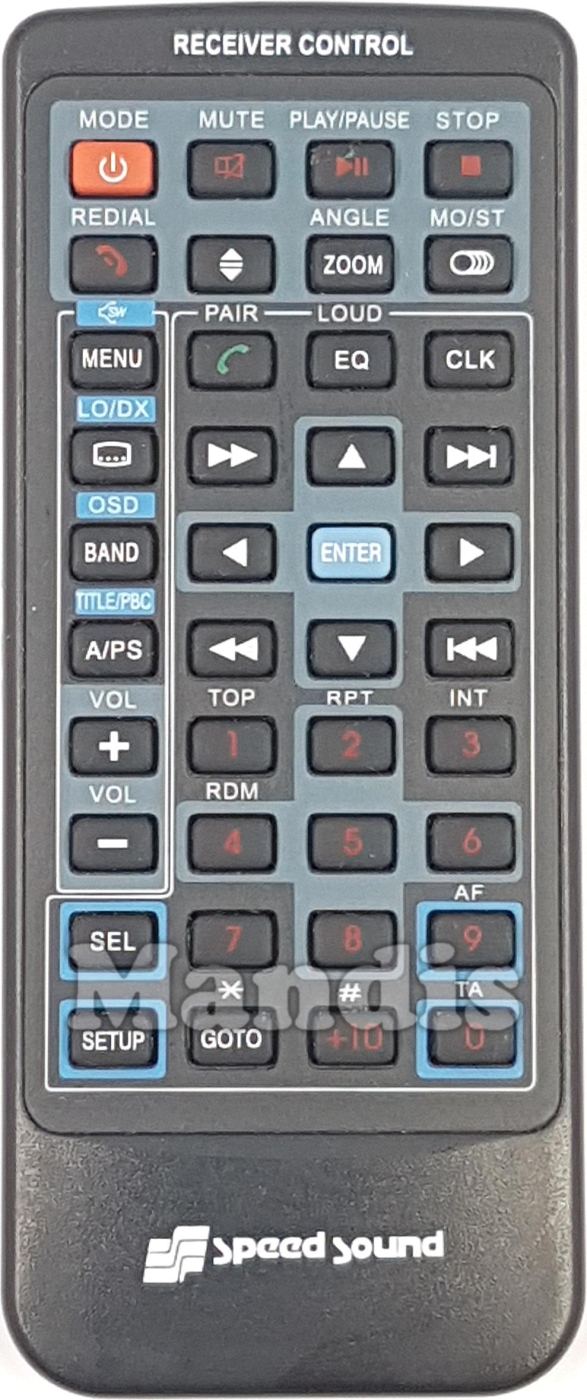Power Mode, Mute, Stop, Play/Pause, Zoom/Angle, MO/ST, ♦, Pick Up/Redial, Hang Up/Pair, Menu, EQ/Loud, CLK, >>I, Up, >>, [...]/LO/DX, Band/OSD, A/PS/Title/PBC, Enter, Right, Left, <<, I<<, Down, Vol+, Vol-, 1/Top, 2/RPT, 3/Int, 4/RDM, 5, 6, 8, 7, Sel, Setup, Goto/*, +10/#, 0/TA, 9/AF