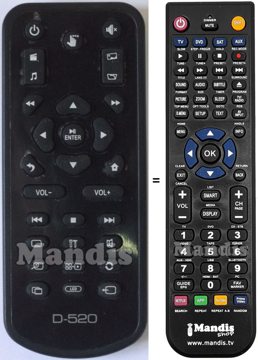 Aquest comandament a distància substitueix completament el teu D520 en totes les seves funcions. No és un comandament universal, sinó una còpia exacta del teu original.
