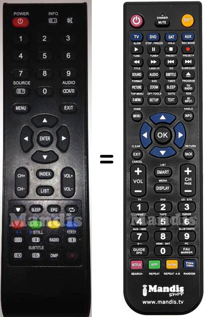 ALERTA: hi ha dues versions d'aquest comandament a distància, tot i que comparteixen les mateixes tecles i tenen la mateixa disposició, les freqüències dels senyals que emeten són diferents. Per aquesta raó, el comandament a distància equivalent compta amb dos codis de programació, un per a cada versió del comandament. El codi corresponent a la primera versió del comandament es troba al botó blau superior TV, mentre que l'altre codi es troba al botó blau superior DVD.