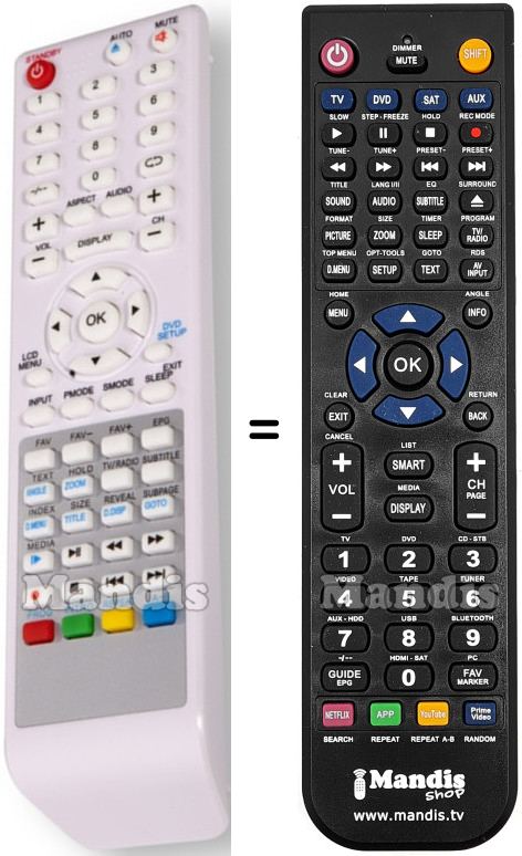 A continuació, us mostrarem la correspondència entre cada un dels botons del comandament original i el botó que realitza la mateixa funció en el comandament de substitució. En alguns casos, és possible que necessiti prémer la tecla SHIFT abans de prémer un altre botó per realitzar certes accions. Aquestes funcions addicionals sovint no s'utilitzen gaire i s'inclouen per facilitar la comprensió del comandament de substitució, o perquè el comandament original té més botons que el seu equivalent.