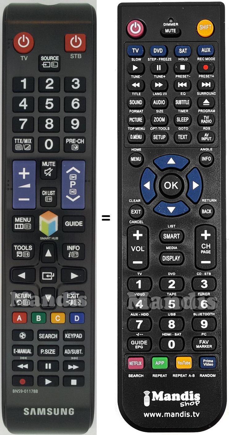 Aquest comandament a distància fa totes les funcions del comandament original: Power Tv, Power STB, Source, 1, 2, 3, 4, 5, 6, 7, 8, 9, TTX/MIX, 0, PRE-CH, Vol+, P+, Vol-, P-, Mute, CH List, Menu, Guide, Smart Hub, Tools, Info, Return, Exit, Left, Right, Up, Down, Enter, Red, Green, Yellow, Blue, Ball, Search, Keypad, E-Manual, P.Size, AD/Subt., <</I<<, Pause, >>/>>I, Rec, Play, Stop