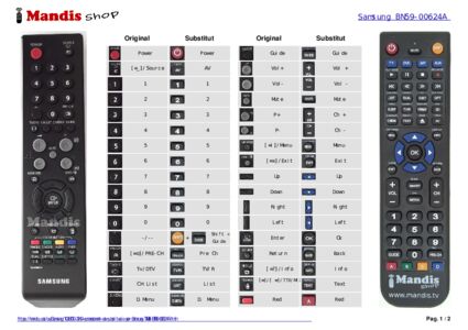 Aquest comandament a distància fa totes les funcions del comandament original: Power, Source, 1, 2, 3, 4, 5, 6, 7, 8, 9, -/--, 0, PRE-CH, TV/DTV, CH List, D.Menu, Guide, Vol+, Vol-, P+, P-, Mute, Menu, Exit, Up, Down, Right, Left, Enter, Return, Info, TTX/MIX, Red, Green, Yellow, Blue, P.Mode, S.Mode, Auto, P.Size, I-II/Dual, Subtitle, Source Green, PIP