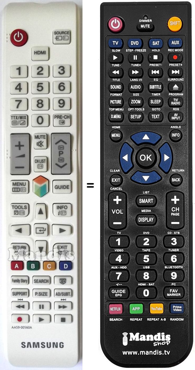 Comandament a distància que substitueix el comandament AA59-00560A en totes les seves funcions. No es tracta d'un comandament universal sinó d'una còpia que substitueix l'original. Rebrà el comandament completament preparat per fer-lo funcionar només necessita posar-li les piles. No cal programar-lo. Té total garantia de que el comandament cumplirà amb les mateixes funcions de l'original.