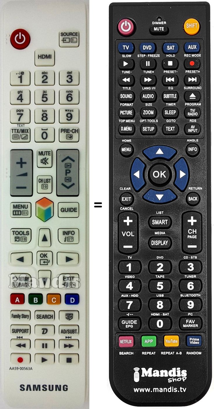 Comandament a distància que substitueix el comandament AA59-00563A en totes les seves funcions. No es tracta d'un comandament universal sinó d'una còpia que substitueix l'original. Rebrà el comandament completament preparat per fer-lo funcionar només necessita posar-li les piles. No cal programar-lo. Té total garantia de que el comandament cumplirà amb les mateixes funcions de l'original.