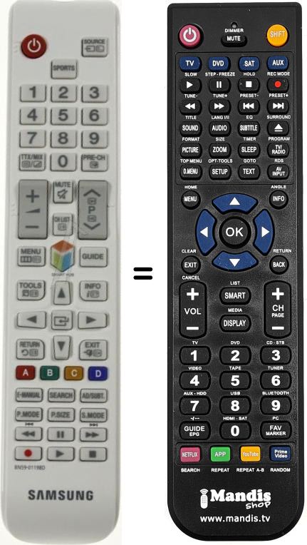 Comandament a distància que substitueix el comandament BN59-01198D en totes les seves funcions. No es tracta d'un comandament universal sinó d'una còpia que substitueix l'original. Rebrà el comandament completament preparat per fer-lo funcionar només necessita posar-li les piles. No cal programar-lo. Té total garantia de que el comandament cumplirà amb les mateixes funcions de l'original.
