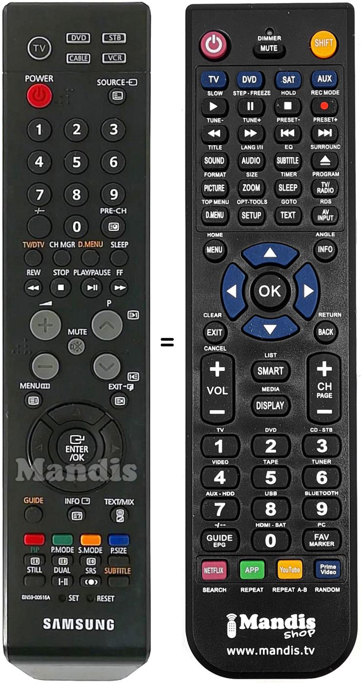 Comandament a distància que substitueix el comandament TM 87 B (BN59-00516A) en totes les seves funcions. No es tracta d'un comandament universal sinó d'una còpia que substitueix l'original. Rebrà el comandament completament preparat per fer-lo funcionar només necessita posar-li les piles. No cal programar-lo. Té total garantia de que el comandament cumplirà amb les mateixes funcions de l'original.