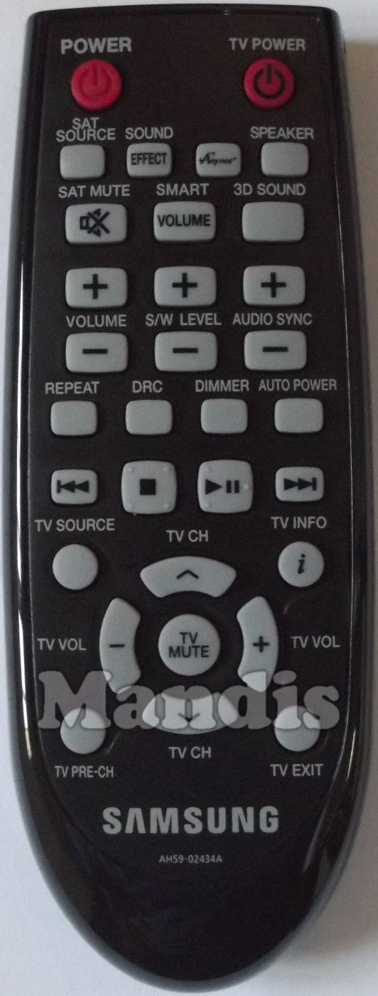 power, tv power, sat source, effect/sound, anynet*, speaker, sat mute, volume/smart, 3d sound, vol+, vol-, s/w level+, s/w level-, audio sync +, audio sync -, repeat, drc, dimmer, auto power, i<<, >>i, stop, play/pause, tv source, tv info, tv pre-ch, tv exit, tv mute, up , down, right, left