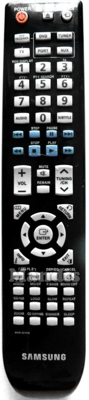 Power, Open / Close, Source, DVD Receiver, DVD, TUNER, PORT, AUX, TV, 1 / RDS Display, 2, 3 / TA, 4 / PTY-, 5 / PTY Search, 6 / PTY+, 7, 8, 9, 0, Audio, Subtitle, I<<, Step, Pause, >>I, <<, Stop, Play, >>, Vol+, Vol-, Mute, Remain, Tuning/CH+, Tuning/CH-, Menu, Return, Up, Left, Enter, Right, Down, Info, Exit, Dolby PL II MODE, Dolby PL II EFFECT, DSP/EQ, Cancel, Tuner Memory, Mo/St, P.Bass, Sound Edit, SD/HD, Logo, Slow, Repeat, Zoom, CD Ripping, Dimmer, Sleep