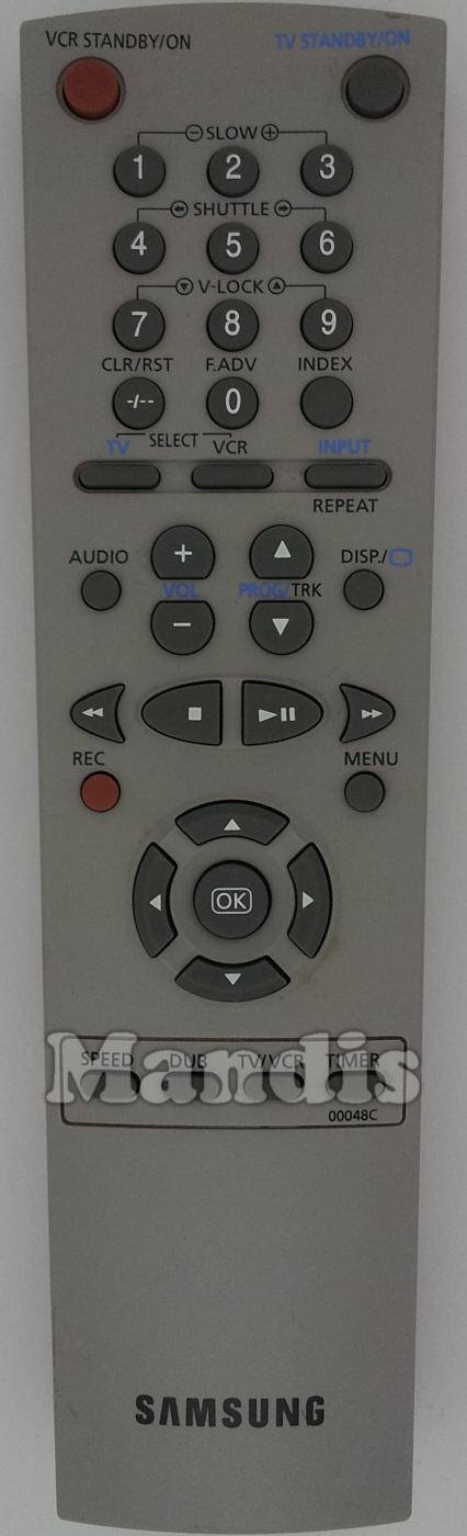 VCR Standby/On, TV Standby/On, 1/Slow-, 2, 3/Slow+, 4/< Shuttle, 5, 6/Shuttle>, 7/V-Lock Down, 8, 9/V-Lock Up, -/--CLR/RST, 0/F.ADV, Index, Input/Repeat, Disp/[ ], Audio, Vol+, Vol-, Prog/TRK+, Prog/TRK-, <<, >>, Stop, Play/Pause, Rec, Menu, Up, Down, Left, Right, OK, Speed, DUB, TV/VCR, Timer