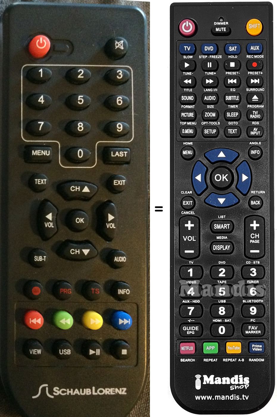 A continuació, us mostrarem la correspondència entre cada un dels botons del comandament original i el botó que realitza la mateixa funció en el comandament de substitució. En alguns casos, és possible que necessiti prémer la tecla SHIFT abans de prémer un altre botó per realitzar certes accions. Aquestes funcions addicionals sovint no s'utilitzen gaire i s'inclouen per facilitar la comprensió del comandament de substitució, o perquè el comandament original té més botons que el seu equivalent.