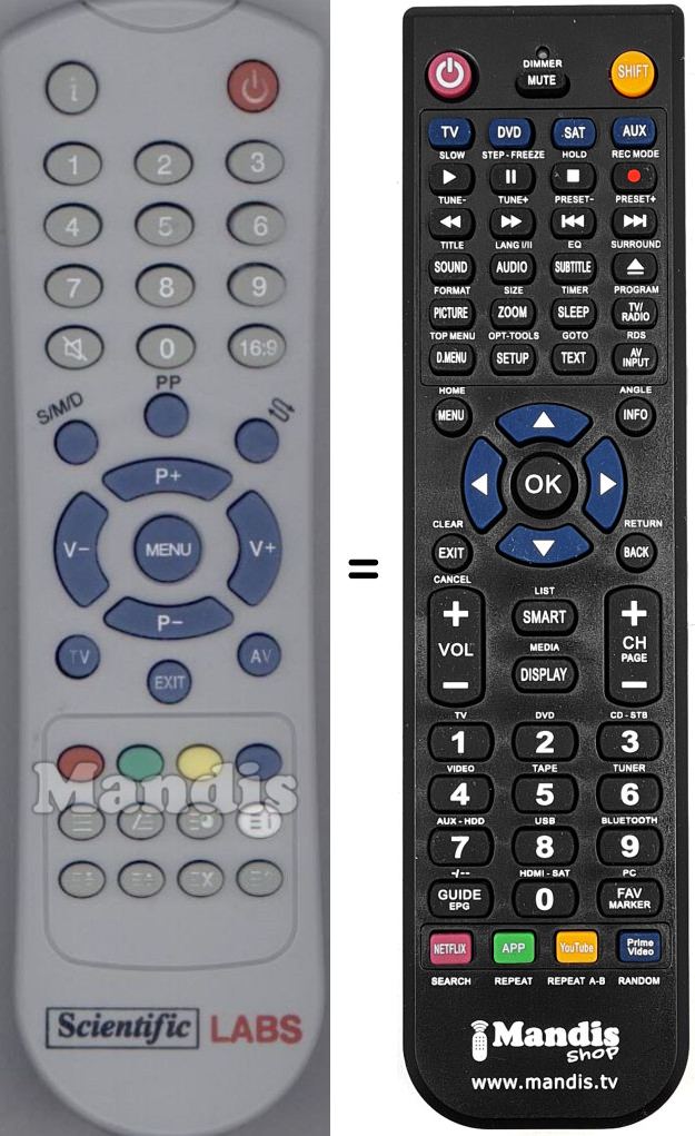 Comandament a distància que substitueix el comandament Scientificlabs002 en totes les seves funcions.