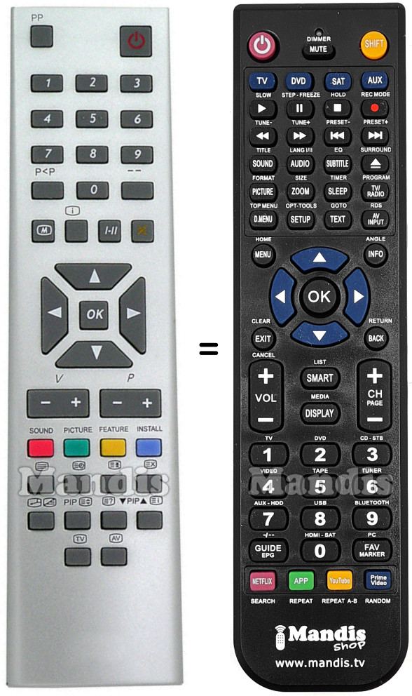 Sí, el comandament equivalent realitza totes les funcions, fins i tot quan el comandament original controla diversos aparells. Al comandament equivalent es poden programar els camps de diferents aparells (TV, DVD, SAT i AUX) d'aquesta manera es pot incloure totes les funcions del comandament original. Si si visualitza el manual de les tecles (instruccions del comandament a distància) podrà comprovar que hi ha totes les funcions.