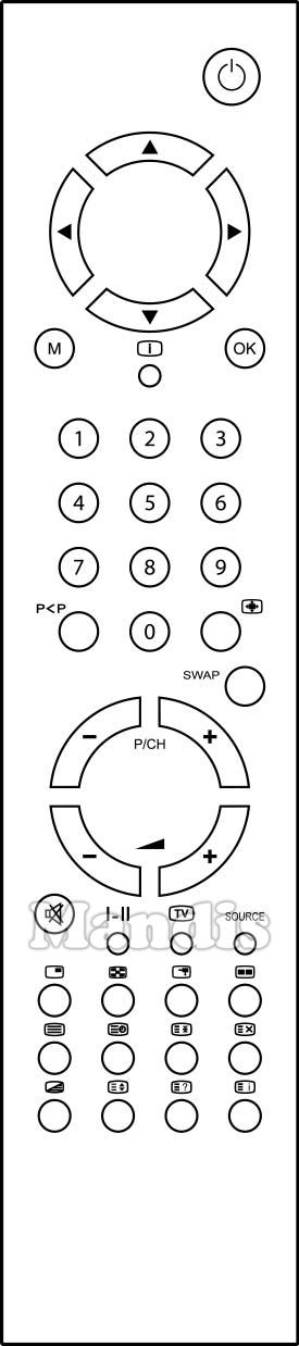 Power, Up, Down, Right, Left, M Menu, [ i ] Info, OK, 1, 2, 3, 4, 5, 6, 7, 8, 9, 0, P < P, Aspect, Swap, P - / CH -, P + / CH +, Vol -, Vol +, Mute, I - II, [ TV ], Source, Red / PIP, Green, Yellow, Blue, Text, Timer, Hold, Cancel, Mix, Size, Help, Index