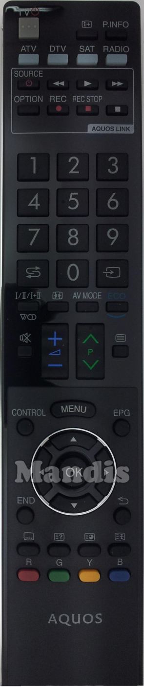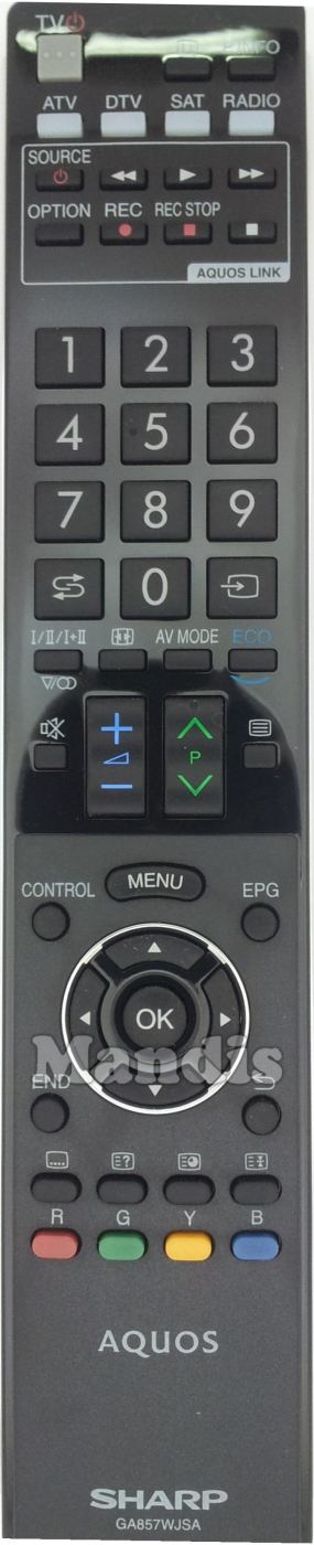 Comandament a distància original GA857WJSA (RRMCGA857WJSA) que serveix per televisors de la marca Sharp. Es tracta d'un model original de comandament a distància.