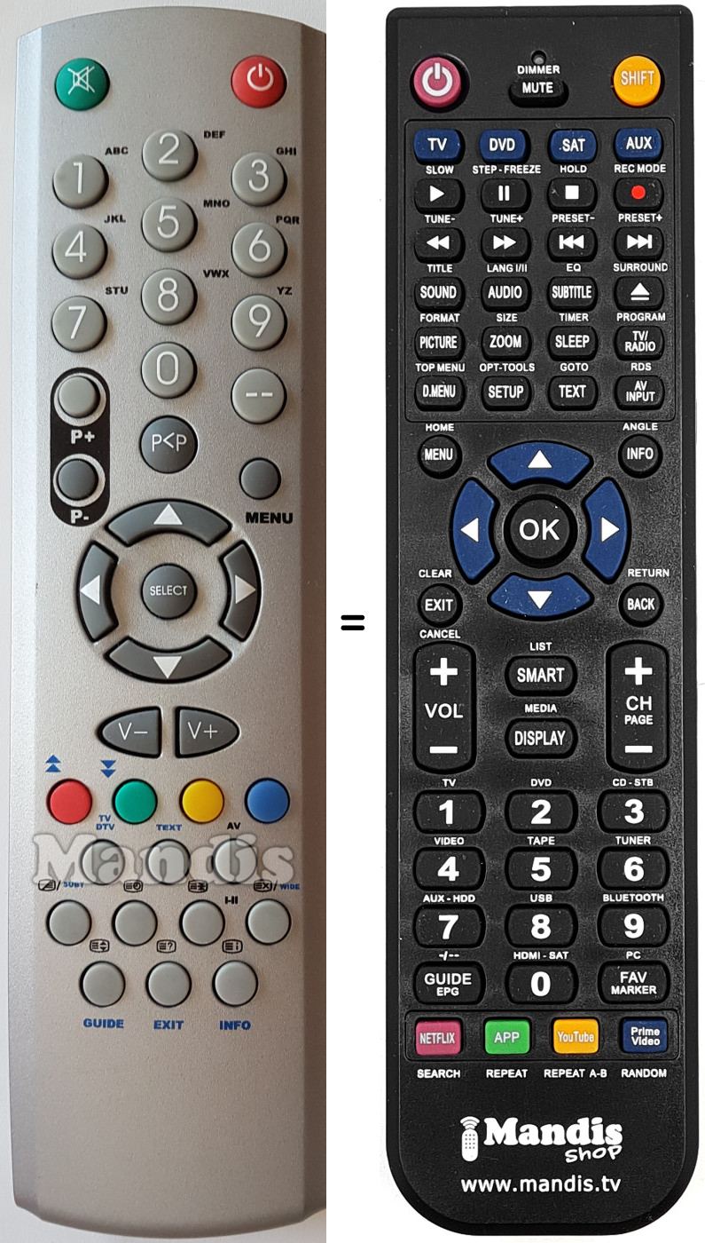 El comandament equivalent realitza totes les funcions, fins i tot quan el comandament original controla diversos aparells. Al comandament equivalent es poden programar diferents aparells amb els boton TV, DVD, SAT i AUX, d'aquesta manera es poden incloure totes les funcions del comandament original. Si si visualitza el manual de les tecles (instruccions del comandament a distància) podrà comprovar que hi ha totes les funcions.