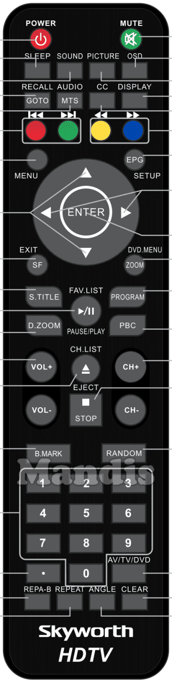 Comandament a distància original SKYWORTH001 que serveix per televisors de la marca Skyworth. Es tracta d'un model original de comandament a distància.