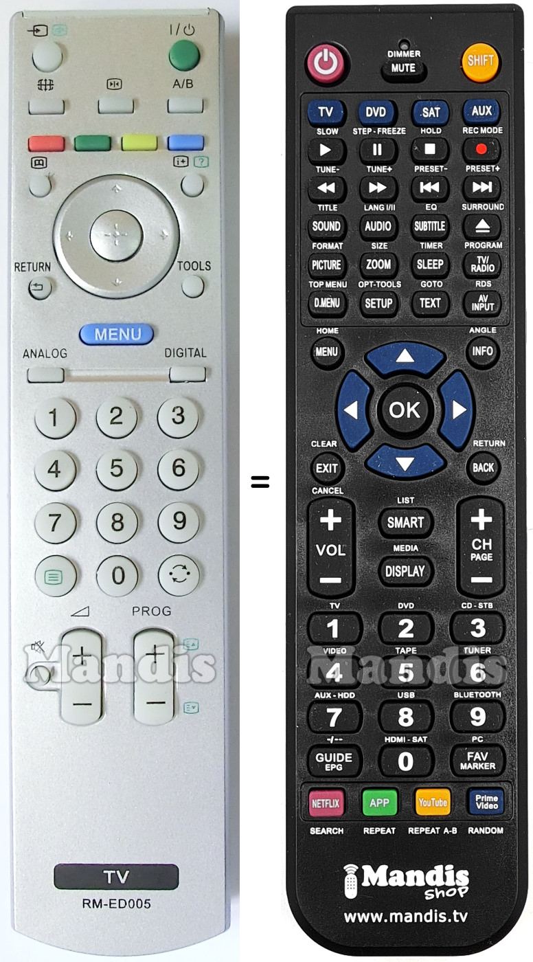 A continuació, us mostrarem la correspondència entre cada un dels botons del comandament original i el botó que realitza la mateixa funció en el comandament de substitució. En alguns casos, és possible que necessiti prémer la tecla SHIFT abans de prémer un altre botó per realitzar certes accions. Aquestes funcions addicionals sovint no s'utilitzen gaire i s'inclouen per facilitar la comprensió del comandament de substitució, o perquè el comandament original té més botons que el seu equivalent.