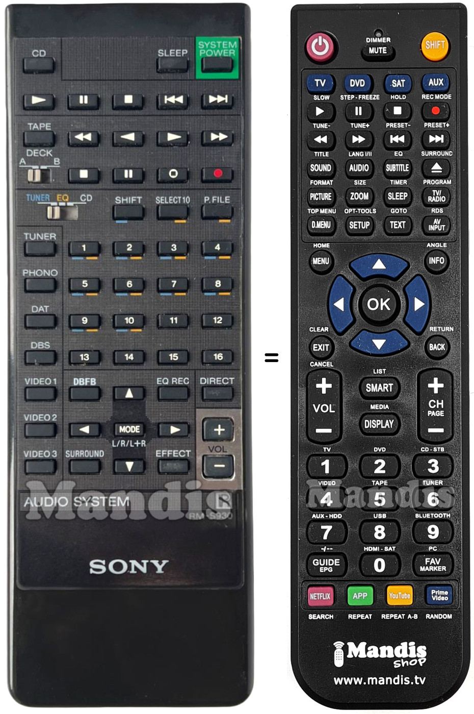 System Power, Sleep, CD, CD Play, CD Pause, CD Stop, CD I<<, CD >>I, TAPE, TAPE <<, TAPE <, TAPE >, TAPE >>, TAPE Stop, TAPE Pause, TAPE Stop Rec, TAPE Rec, Shift, Select 10, P.File, TUNER, PHONO, DAT, DBS, Video 1, Video 2, Video 3, 1, 2, 3, 4, 5, 6, 7, 8, 9, 10, 11, 12, 13, 14, 15, 16, DBFB, EQ Rec, Surround, Effect, Up, Left, Mode L/R/L+R, Right, Down, Direct, Vol+, Vol-