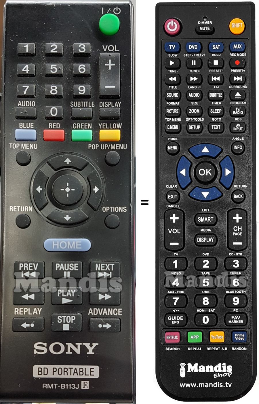 Aquest comandament a distància substitueix completament el teu RMT-B113J en totes les seves funcions. No és un comandament universal, sinó una còpia exacta del teu original.