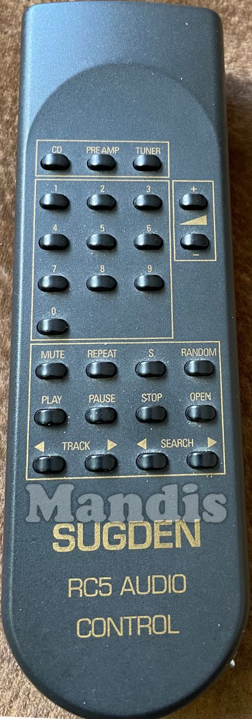 Comandament a distància original RC5-3 de la marca Sugden Audio. Es tracta d'un model original de comandament a distància.