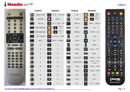 A continuació, us mostrarem la correspondència entre cada un dels botons del comandament original i el botó que realitza la mateixa funció en el comandament de substitució. En alguns casos, és possible que necessiti prémer la tecla SHIFT abans de prémer un altre botó per realitzar certes accions. Aquestes funcions addicionals sovint no s'utilitzen gaire i s'inclouen per facilitar la comprensió del comandament de substitució, o perquè el comandament original té més botons que el seu equivalent.