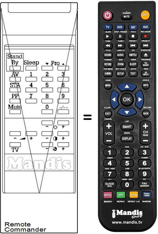 Comandament a distància que substitueix a l'original en totes les seves funcions. No es tracta d'un comandament universal sinó d'una còpia que substitueix l'original. Rebrà el comandament completament preparat per fer-lo funcionar només necessita posar-li les piles. No cal programar-lo. Té total garantia de que el comandament cumplirà amb les mateixes funcions de l'original.