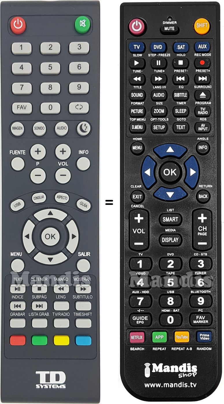 A continuació, us mostrarem la correspondència entre cada un dels botons del comandament original i el botó que realitza la mateixa funció en el comandament de substitució. En alguns casos, és possible que necessiti prémer la tecla SHIFT abans de prémer un altre botó per realitzar certes accions. Aquestes funcions addicionals sovint no s'utilitzen gaire i s'inclouen per facilitar la comprensió del comandament de substitució, o perquè el comandament original té més botons que el seu equivalent.