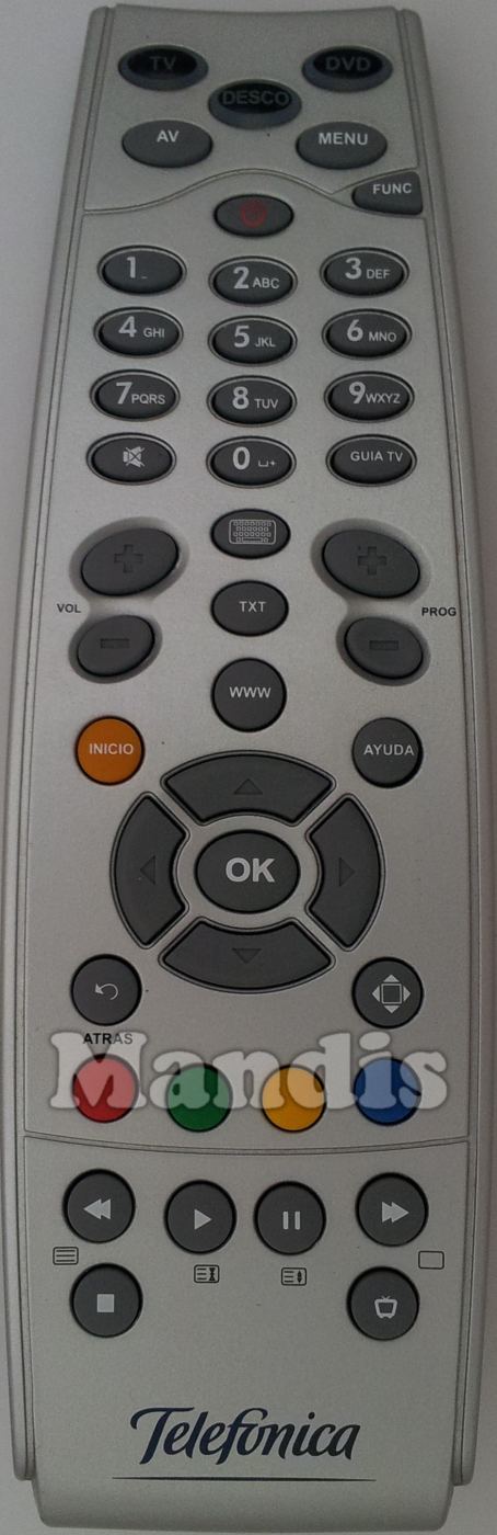 TV, DVD, Desco, AV, Menu, Func, Power, 1, 2, 3, 4, 5, 6, 7, 8, 9, 0, Mute, Guia TV, Keyboard, Vol+, Vol-, TXT, PROG+, PROG-, WWW, Inicio, Ayuda, Up, Down, Left, Right, OK, Atrás, ◇, Red, Green, Yellow, Blue, <</[≡], Play/[≡⧗], Pause/[≡↕], >>/▭, Stop, TV