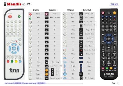 A continuació, us mostrarem la correspondència entre cada un dels botons del comandament original i el botó que realitza la mateixa funció en el comandament de substitució. En alguns casos, és possible que necessiti prémer la tecla SHIFT abans de prémer un altre botó per realitzar certes accions. Aquestes funcions addicionals sovint no s'utilitzen gaire i s'inclouen per facilitar la comprensió del comandament de substitució, o perquè el comandament original té més botons que el seu equivalent.