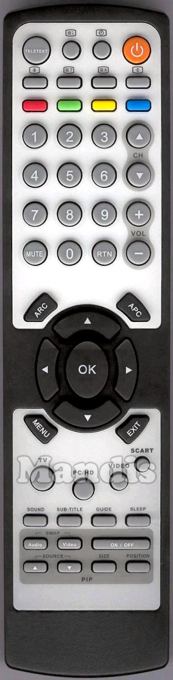 Power, Clock / Subpage, Index, Teletext, Hold, Reveal, Cancel, Size, Red, Green, Yellow, Blue, 1, 2, 3, 4, 5, 6, 7, 8, 9, 0, Mute, RTN, CH+, CH-, Vol+, Vol-, ARC, APC, Up, Left, OK, Right, Down, Menu, Exit, TV, PC/HD, Video, Scart, Sound, Sub-Title, Guide, Sleep, PIP Swap Audio, PIP Swap Video, PIP On/Off, PIP Source+, PIP Source-, PIP Size, PIP Position