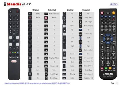 A continuació, us mostrarem la correspondència entre cada un dels botons del comandament original i el botó que realitza la mateixa funció en el comandament de substitució. En alguns casos, és possible que necessiti prémer la tecla SHIFT abans de prémer un altre botó per realitzar certes accions. Aquestes funcions addicionals sovint no s'utilitzen gaire i s'inclouen per facilitar la comprensió del comandament de substitució, o perquè el comandament original té més botons que el seu equivalent.