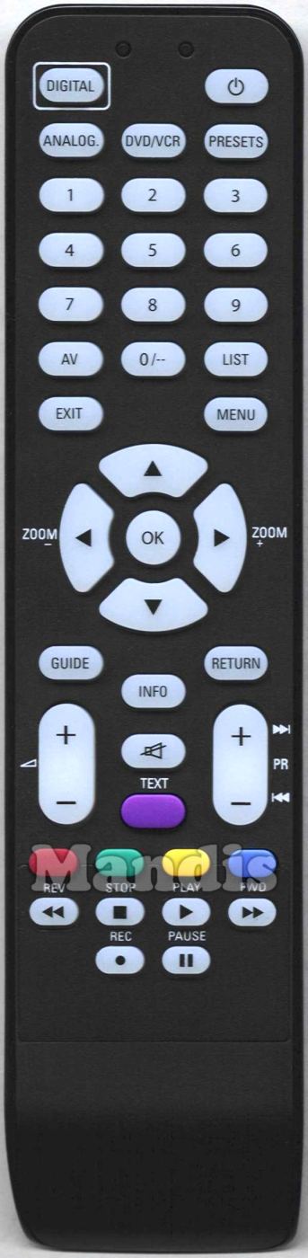Power, Digital, Analog., DVD / VCR, Presets, 1, 2, 3, 4, 5, 6, 7, 8, 9, 0 / --, AV, List, Exit, Menu, Up, Down, Right / Zoom +, Left / Zoom -, OK, Guide, Info, Return, Mute, Text, Vol +, Vol -, PR + / >>I, PR - / I<<, Red, Green, Yellow, Blue, <<, Stop, Play, >>, Rec, Pause