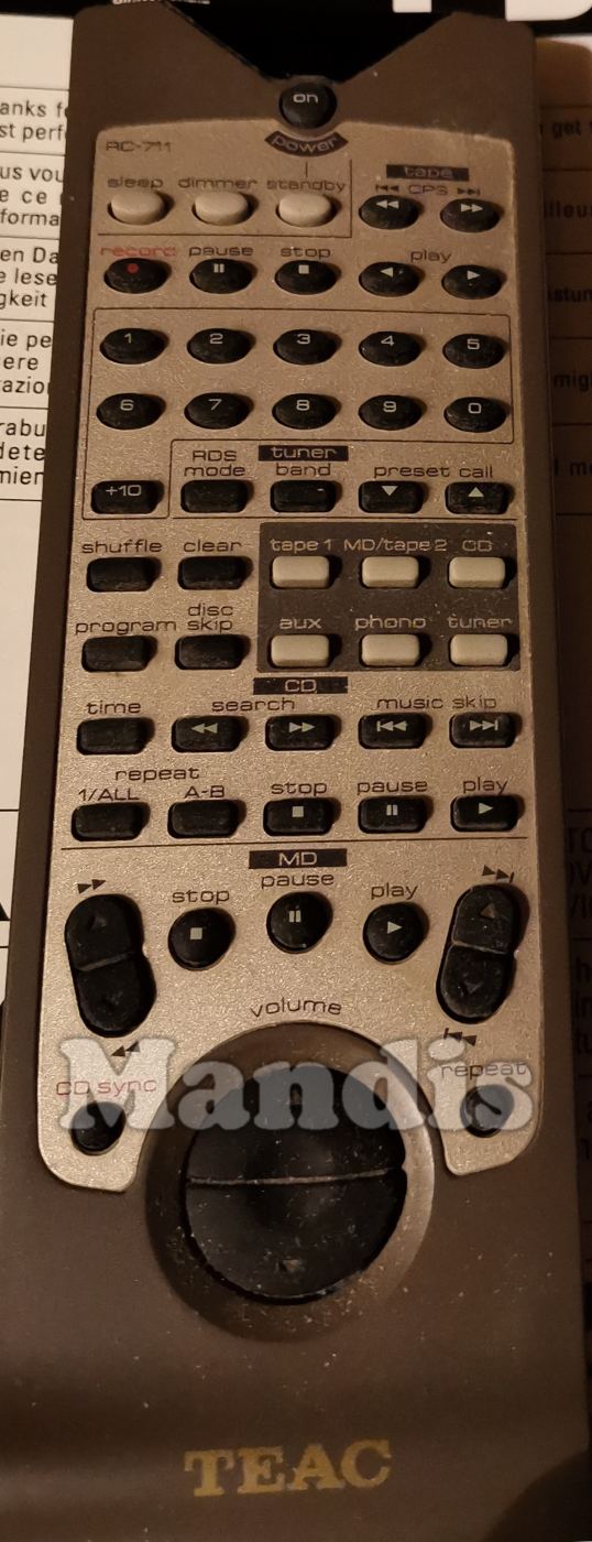Comandament a distància original RC-711 de la marca Teac. Es tracta d'un model original de comandament a distància.