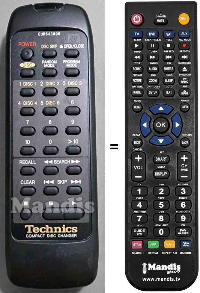 Comandament a distància que substitueix el comandament EUR643806 en totes les seves funcions.
