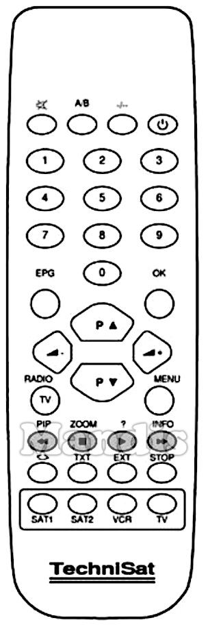 Power, -/--, A/B, Mute, 1, 2, 3, 4, 5, 6, 7, 8, 9, 0, EPG, OK, Up / P+, Down / P-, Right / Vol+, Left / Vol-, TV/Radio, Menu, Red / PIP, Green / Zoom, Yellow / ?, Blue / Info, Recall, TXT, Ext, Stop, SAT1, SAT2, VCR, TV