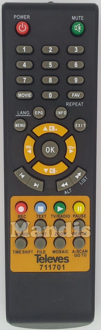 POWER, MUTE, 1, 2, 3, 4, 5, 6, 7, 8, 9, 0, MOVIE, FAV/REPEAT, MENU/LANG, EPG, INFO, EXIT, CH+, CH-, VOL+, VOL-, OK, I<, >I, <</ALT, >>/LIST, RED/REC, BLUE/STOP/TEXT, GREEM/PLAY/TV/RADIO, YELLOW/PAUSE, AUDIO, SUBT., ZOOM, DEVICE, TIME SHIFT, FILE, MOSAIC, A-SCAN GOTO