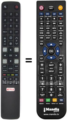 Aquest comandament a distància fa totes les funcions del comandament original: power, mute, 1, 2, 3, 4, 5, 6, 7, 8, 9, 0, pre-ch, list, [i], ☼, vol+, vol-, p+, p-, home, ≡, ←, source, ok, up, down, right, left, exit, o)/lang, text, subt., guide, red, green, yellow, blue, <<, pause, >>, zoom, play, stop, netflix